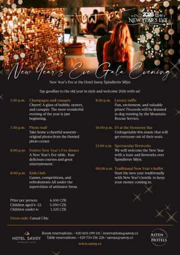 The end of the year is approaching, and with it the most entertaining night of the year. Imagine the stunning atmosphere of the snow-covered Krkonoše Mountains, where you can say goodbye to the old year and welcome the new one in complete comfort, luxury, and above all in style with the best fireworks you've ever seen!