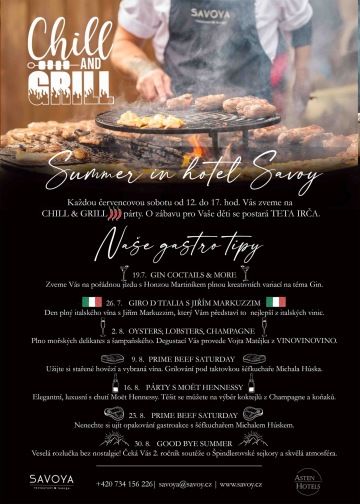 Léto je tady a s ním i ideální příležitost, jak si užít slunečné dny v pohodové atmosféře. Přijďte si odpočinout, pobavit se a ochutnat ty nejlepší grilované dobroty na našich Chill and Grill Párty během celého července. Ty se konají každou sobotu od 12.00 do 17.00 a budou plné pohody, lounge muziky, grilování, letních osvěžujících spritzů plných rozmanitých chutí a barev. Pojďme společně slavit léto, které nikdy neskončí!