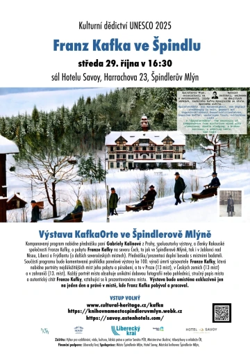 Ve středu 29. 10. 2025 od 16:30 proběhne v našem hotelu Savoy (dříve Hotel Krone) prezentace výstavy a doprovodná přednáška, kterou povede Gabriela Kalinová, překladatelka a průvodkyně, doplněná dalšími odborníky. Součástí bude i jednodenní panelová výstava. Akce se koná ve spolupráci s Městskou knihovnou Špindlerův Mlýn a hotelem Savoy. V hotelu Savoy (dříve Krone) začal Franz Kafka psát svůj vrcholný román Zámek. Zasněžená krajina Krkonoš se mu stala inspirací k příběhu, jehož děj začíná ve vesnici ležící pod sněhem. Zámek je považován za autorovo nejvýznamnější, i když nedokončené dílo a symbolicky otevírá cestu k hlavnímu tématu moderní literatury – k obrazu lidské existence v celé její křehkosti, rozporuplnosti, odcizenosti a absurditě. Výjimečné spojení místa a díla dodává hotelu Savoy jedinečný význam – stává se součástí literární historie a svědectvím o okamžiku, kdy vznikalo jedno z nejvlivnějších děl 20. století. O sto let později byla u hotelu odhalena busta Franze Kafky, vytvořená s podporou Sekyra Foundation, která tuto symboliku připomíná i současným návštěvníkům.